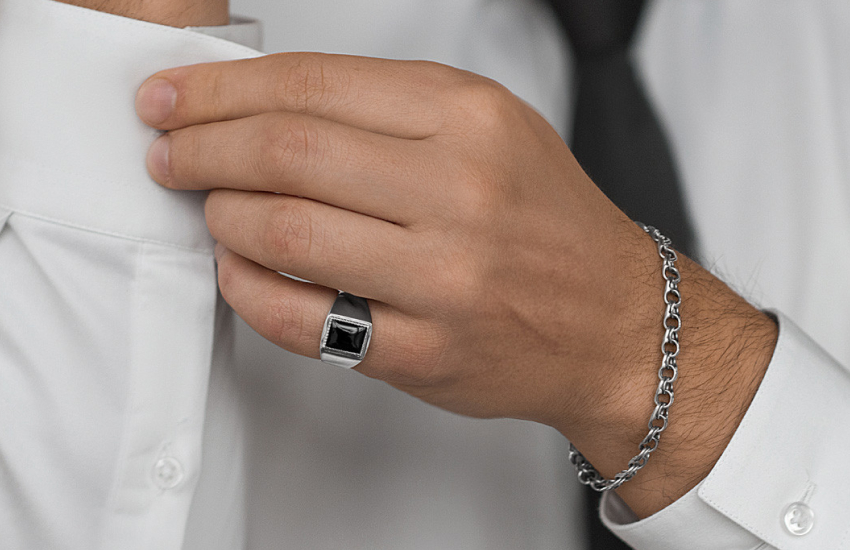 Женщинам с холодной внешностью подходят серо-белые или лавандовые оттенки камня, а тёплому цветотипу лица — оникс с карамельным или оливковым тоном. Мужские украшения, как правило, используют чёрный минерал или экспрессивно полосатый с монохромной гаммой. Отлично смотрятся перстни, запонки, браслеты из кожи с вставками из оникса.