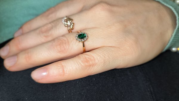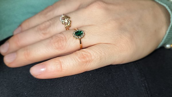 Очень аккуратное кольцо . 1 изумруд , 12 бриллиантов 17 огранки . Ничего лишнего . Нет . Влюбилась когда выбирала онлайн .