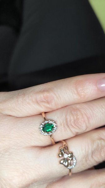 Нежное, изящное, клеймо лазерное на внешней стороне кольца, еле разглядела. Заказала одно кольцо, ну купила это, я очень люблю изумруд!