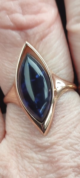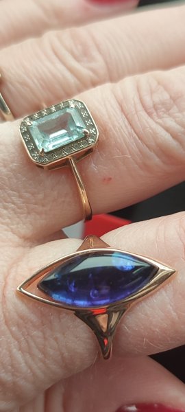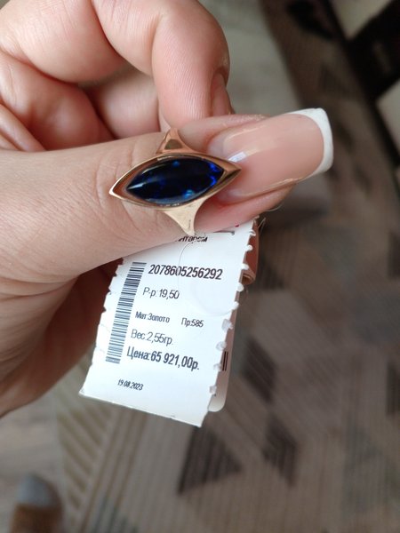 Кольцо красивое, необычное. Ювелир был удивлён, когда понял, что янтарь)) сказал, всех цветов янтарь видел, синий никогда)) Пол года ловила это кольцо, заказала 18,5 как самый большой размер из всех моих пальцев, НО!!! Натянула я его довольно легко, хотя была мысль вернуть и заказать 19 размер, а снять смогла спустя десять минут чуть не сломав палец. Поехала к ювелиру и оказалось, что кольцо 18 размера+с такой орбитой нужно было брать на полтора размера больше. В итоге долбили его старым дедовским способом, ибо бока пустотелые, сбив пробу. Очень сильно маломерит, имейте ввиду, берите на размер больше, а то и полтора