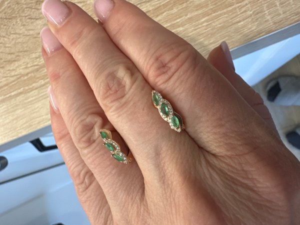 Целый месяц искала украшения с изумрудами, хотелось несколько камней в сочетании с бриллиантами (пусть даже крохотными) и по приемлемой цене. Искала везде, и ездила по магазинам и онлайн, и вот в один прекрасный вечер я наткнулась на серьги (я в итоге купила комплект), серьги меня очень заинтересовали и я увидела к ним кольцо, затем я съездила в магазин дабы увидеть всё в реальности, мне всё понравилось, но не было размера и размер скидки был меньше чем в онлайн приложении, поэтому решено было заказать всё в приложении, уж очень привлекательная скидка была! В итоге через несколько дней мой заказ прибыл в магазин (я захотела забрать в магазине), я приехала в магазин, проверила изделия в федеральной пробирной палате (заранее гуглила) и забрала свой заказ. Серьги довольно миленько смотрятся, я брала комплект для постоянной носки, поэтому все тонкости учла, например самым важным было чтобы в них удобно было спать, застёжка не колется, ухо не выворачивает никуда 😁 и не растегиваются когда ворочаешься во сне. Изумруды в этих украшениях смотрятся красиво, размер камней и их количество тоже сыграл свою роль при выборе, во многих украшениях которые я смотрела либо один камень такого же размера, либо несколько мелких, здесь же всё идеально на мой взгляд, и малюсенькие бриллианты здесь тоже в тему, так как если бы они были крупнее, то смотрелось бы более грубо. В общем я довольна ) Наборчик мне обошёлся в 39.541руб. Так что рекомендую данные изделия и магазин, не бойтесь заказывать.