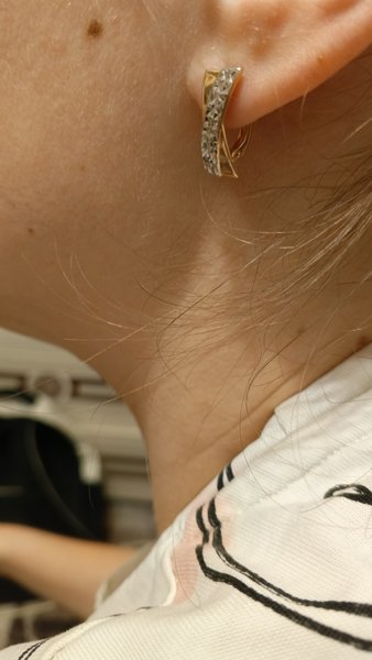 Крупные серьги,красивые,отлично смотрятся.Удобно одевать,замок надёжный .Белое и розовое золото м алмазной гранью ярко сияют. Нет Рекомендую к покупке.Подойдут женщине любого возраста