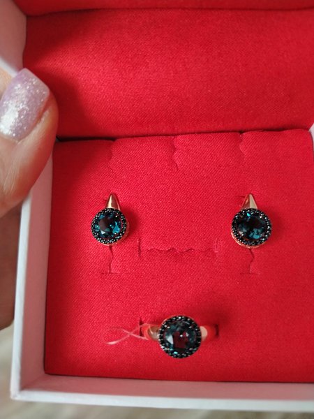 Давно хотела купить этот комплект. Кольцом довольна очень, грани классно играют на свету. Серьги маленькие, а камень оказался почти черный, я даже расстроилась, и вышло, что просто черные серьги в ушах. Камень сильно отличается у кольца и сережек, у кольца грубокий сине-голубой с переливами, а у сережек мутный и еле видны слабые блики синевы... хотя огранка камней у кольца и сережек одинаковая.