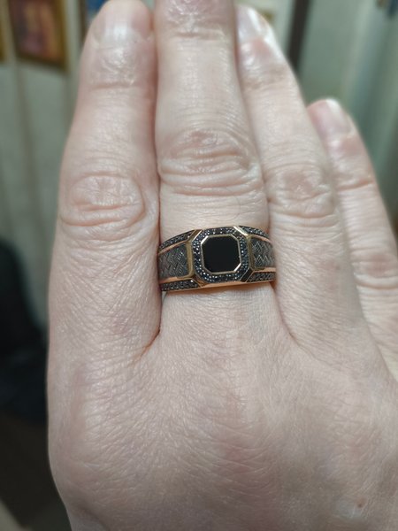 Солидное кольцо, смотрится достойно. Оригинальный дизайн. Полновесное, удобно сидит на руке.
