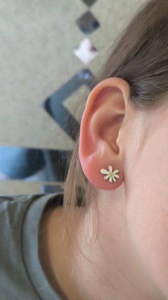 Необычные ромашки с эмалью. Приятно смотрятся на мочке, понравились.