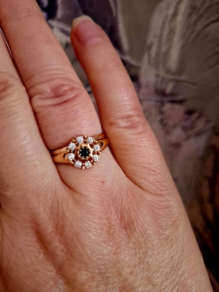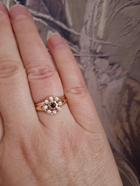 Ну очень красивое алмазы сверкают сапфирчик блестит такая маленькая драгаценность которая радует глаз. Побольше бы золота добавить в шинку кольца для плотности Приобретала для подарка думаю понравится.