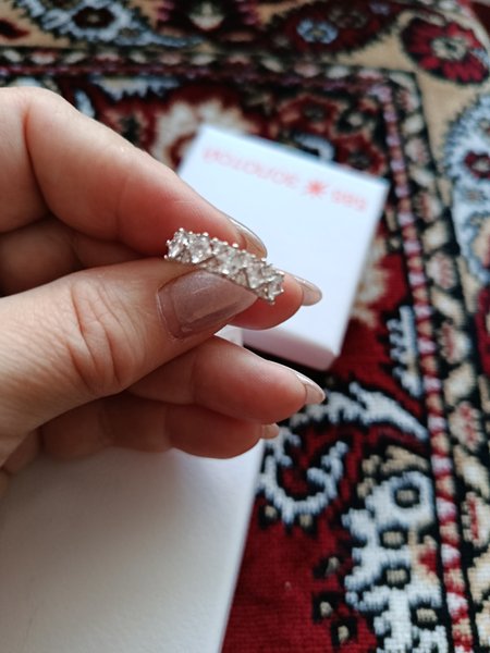Купила второе такое кольцо, маме понравилось, выглядит очень дорого, а стоит копейки. Блестит как бриллиант. По размеру очень хорошо сидит. Не увидела.