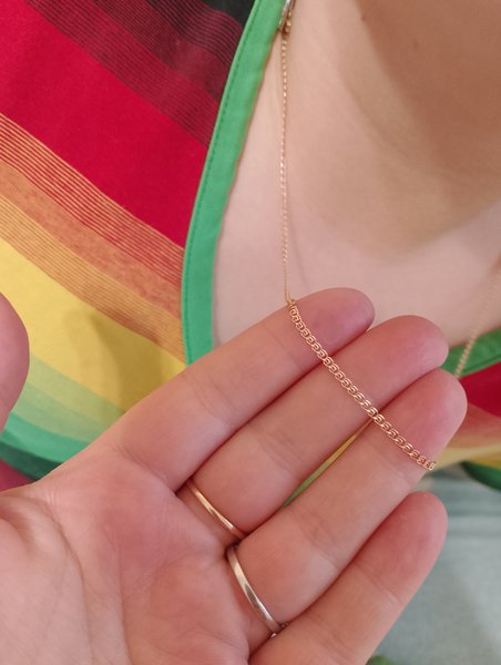 Красивое плетение, блестит, полновесное, размер 40 для меня супер На фото в описании кажется толще, в реальности немного тоньше, цвет цепи немного уходит в розовый или красный оттенок если приглядываться, у меня есть подвеска тоже 375-й пробы но она от цепи отличается немного цветом, и ещё есть подвеска 585-й пробы, она тоже немного отличается от данной цепи, но буду носить с удовольствием, если не приглядываться то разница не видно. Красивая цепочка, красивое плетение,вес чувствуется в в руке))))не ниточка☺️!