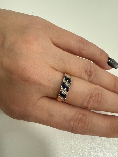 Красивое, нежное и одновременно объемное кольцо. Сапфиры красиво переливаются в синевой. В онлайн магазине не было информации о составе Золото 375 пробы(!). 12 бриллиантов и 6 сапфиров. Вес самого золота 1.74гр. как я поняла. За столь низкую цену (~13к) считаю очень даже достойное кольцо))) Абсолютно довольна покупкой!☺️