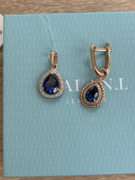 Красивый комплект удалось подобрать.Изначально подбирала к кольцу с лондонским топазом.Серьги с сапфир понравились,и потом подобрала к ним кулон.Это называется парюра.