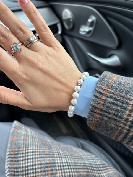 Браслет смотрится очень нежно, не крупные жемчужинки, самое то. В размер идеально.