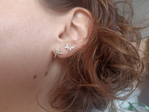 Чудесные стрекозки! Запали они мне сразу, хотела для второго прокола себе гвоздики, думала что-то посерьёзнее купить, но стрекозы меня очаровали) Хорошо смотрятся, сидят на ушке красиво, хороший винтовой замочек. Маленькие, но заметные и не тонкие, добротные. Очень давольна!
