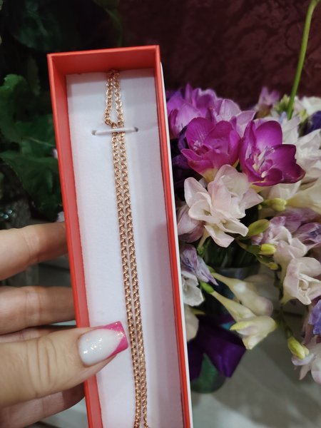 Очень нежная цепочка. Ширина чуть больше 2 мм. Плоская. Необычное плетение, красиво смотрится