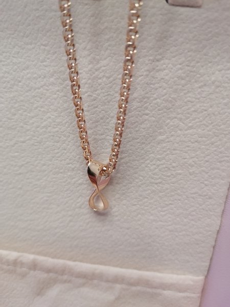 Очень оригинальная форма в виде ленты Мёбиуса. Выглядит изящно, особенно на короткой цепочке Рекомендую для юной особы