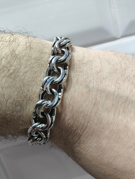 Очень красивый браслет! Ношу не снимая, каждый день, сделан качественно, смотрится стильно, карабин надёжный, звенья большие и крупные!