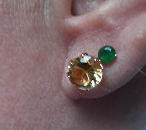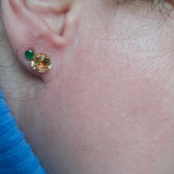 Два " не очень маленьких" солнышка на ушках. Очень интересная огранка, камень прям сверкает. На фото винтовой замок, по факту обычный. Очень красивые, не"забитые" золотом гвоздики.