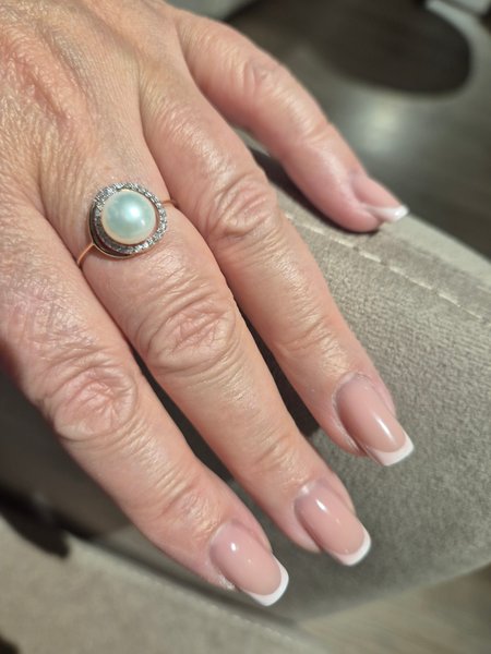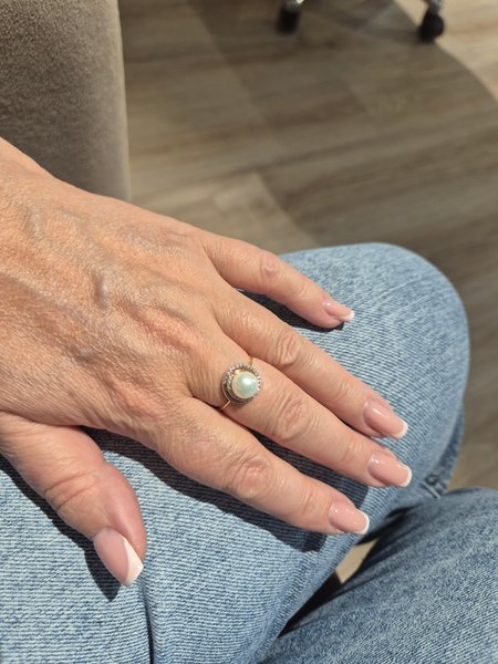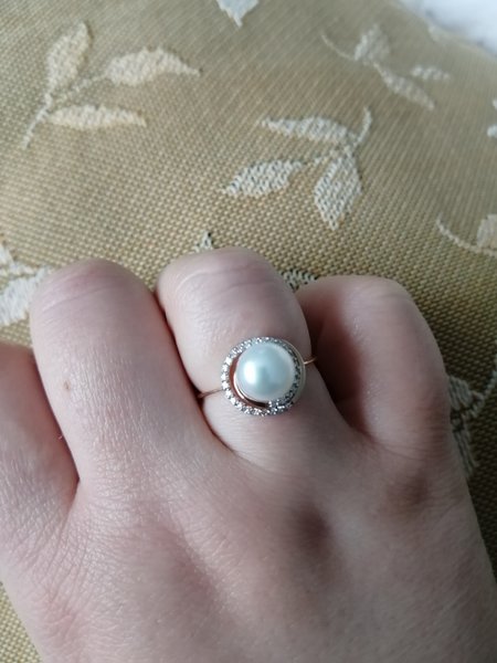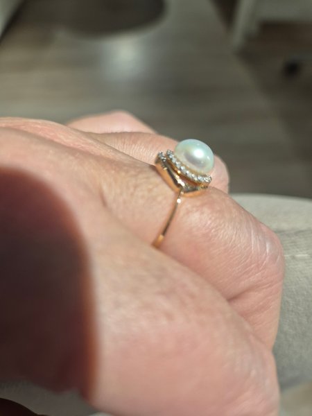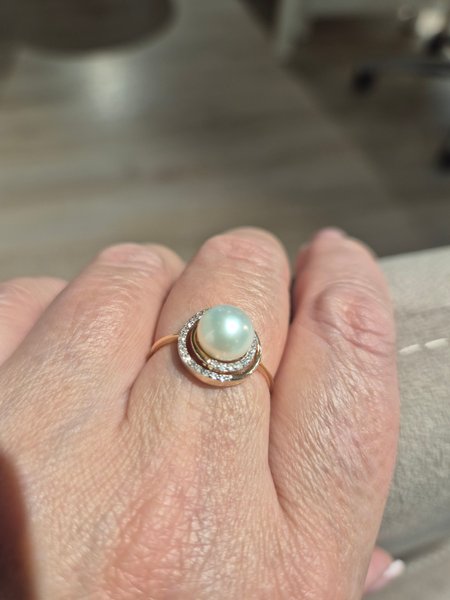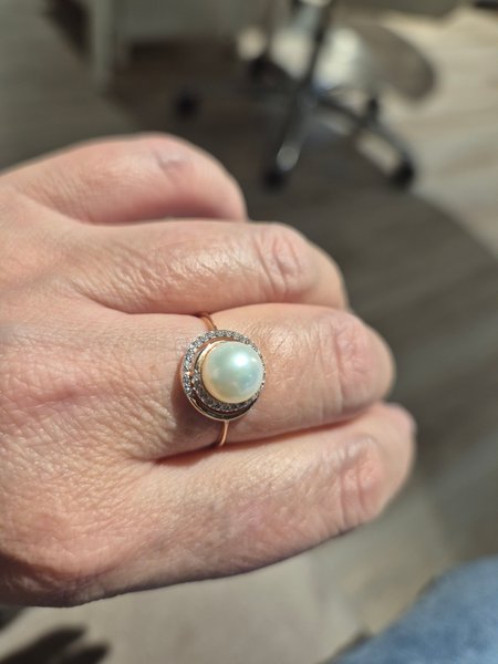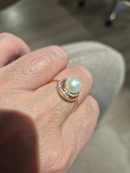 Нежное колечко с изящным, почти незаметным ободком и акцентом на жемчуг и блиллиантовую спираль. Фото не передает сияние бриллиантов. Жемчужина крупная, красивого нежного оттенка, чуть приплюснутая , именно такую хотела, так как в предыдущем кольце жемчуг сильно выступал, цеплялся за все, несколько раз соскакивал, ломался штифт.А здесь практично и роскошно!