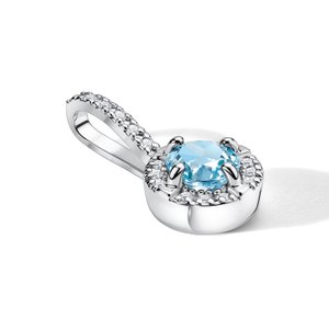 Золотая подвеска с топазом и бриллиантами рассказывает историю о нежности и женственности. Центральным акцентом служит голубой топаз, обрамлённый сияющим ореолом из бриллиантов. А белое золото придаёт украшению особую утончённость. Подвеска идеально дополняется серьгами и кольцом из этого же комплекта.